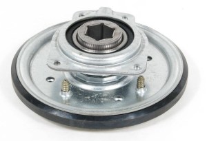 Trinn 5: Fjern friksjonsskiven/friksjonshjulet. Trykk lett på den venstre enden av akselen for å skyve lageret ut av rammens høyre side. Fjern lageret. Dra forsiktig ned og til venstre. Trekk friksjonsskiven/friksjonshjulet av akselen. Merknad: Det holder ofte som regel kun å bytte selve gummi-hjulet og ikke hele friksjonshjulet.