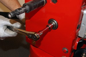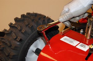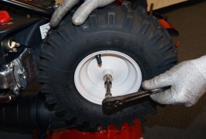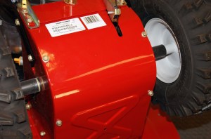 MERK: På de fleste snøfresere med friksjonshjul, holder som regel kun å bytte selve gummiringen som er klemt mellom friksjonshjulet. Det er i de aller fleste tilfeller kun selve gummien som blir slitt. Det er også mer kostnads-besparende å kun bytte gummien og ikke hele friksjonshjulet. Prosessen er den samme som beskrivelsen nedenfor, men i stedet for å bytte hele friksjonshjulet, splitter man den og bytter kun gummiringen. Når ny gummiring er montert, klemmer man fast gummiringen mellom metall-hjulet og monterer hele friksjonshjulet tilbake på akselen.