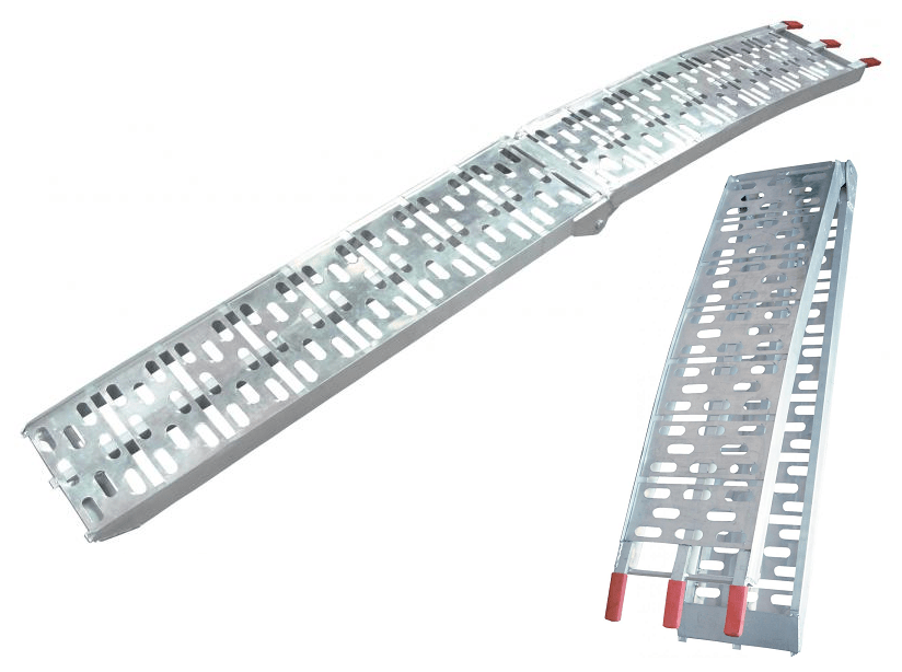 Spesifikasjoner/teknisk informasjon: Foldbare aluminiumsramper. Lasteevne i kg pr bro : 350 kg/ 700kg pr par.. Lengde utfoldet 225 cm.. Bredde mellom styrekantene 28 cm.. Lengde sammenlagt 112 cm. Utmerket for snøfreser, ATV, UTV, hagetraktor, MC m.flere.