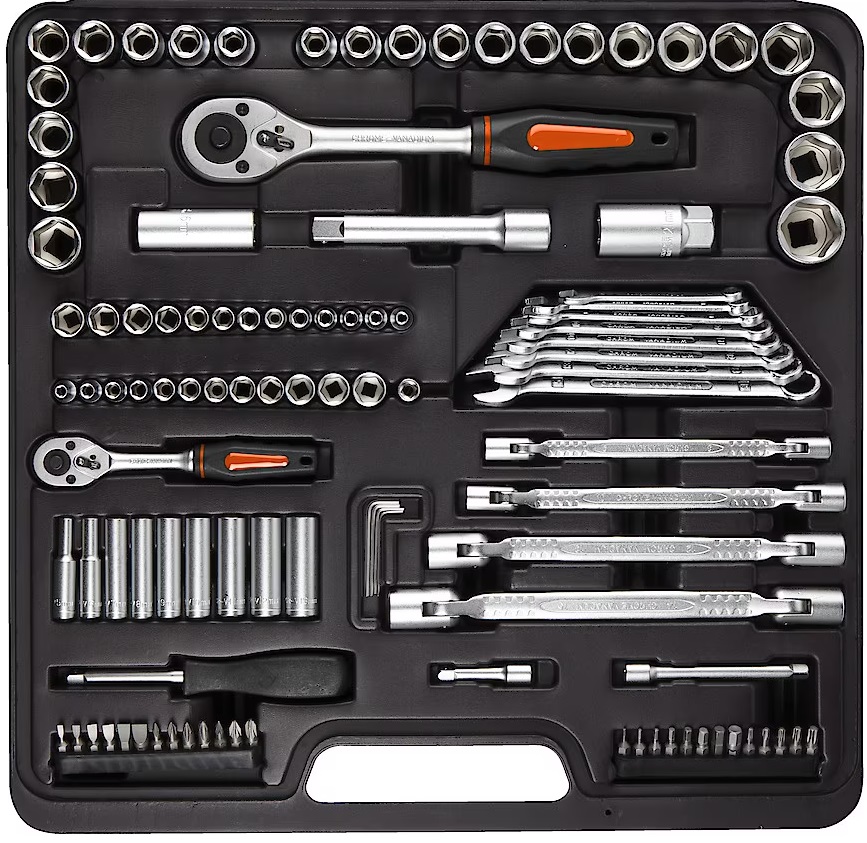 Spesifikasjoner/teknisk informasjon: Stort verktøysett av god kvalitet. 108 deler – en mengde forskjellige hylser, nøkler, bits etc. i forskjellige størrelser. Alt i en praktisk koffert – lett å ta med. Kromvanadiumstål med 1/4″ og 1/2″ feste. Inneholder 27 hylser 4-27 mm, 12 hylser 5/32″-1/2″, 9 lange hylser 5-13 mm, 2 skraller, forlenger 50/100/125 mm, skrutrekkerhåndtak/forlenger 150 mm, 8 kombinasjonsnøkler 7-15 mm, 4 leddnøkler 8-15 mm, tennplugghylser 16/21 mm, bitsholder, 26 bits for spor/PH/PZ/sekskant/T og 4 sekskantnøkler.