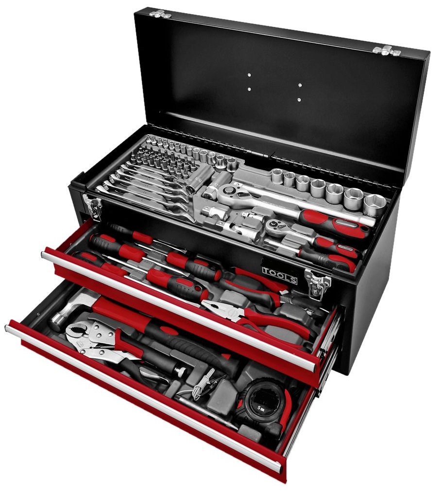 Spesifikasjoner/teknisk informasjon: Verktøykommode/koffert med verktøy, nøkler, piper, tenger, målebånd og spenningstester. Robust metallkonstruksjon. Bærehåndtak. Inneholder det meste man trenger av verktøy. Flere håndverktøy. Sekskant- og kombinasjonsnøkler. Universalledd, forlengere og piper.